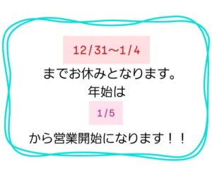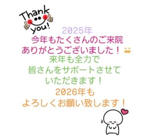 年末年始休暇 公開日:2025年12月29日 お知らせ 【年末年始の休暇】 12/31~1/4 までのお休みとなります。 ご迷惑おかけしますが よろしくお願い致します。 お問い合わせにつきましては LINEか留守電にてお願い致します。 今年もありがとうございました! 良いお年をお迎えください!! 関連記事 明日は晴れ♪腕のねじれ食生活9月のスケジュール頭痛!季節の変わり目 投稿ナビゲーション 2026年1月スケジュール